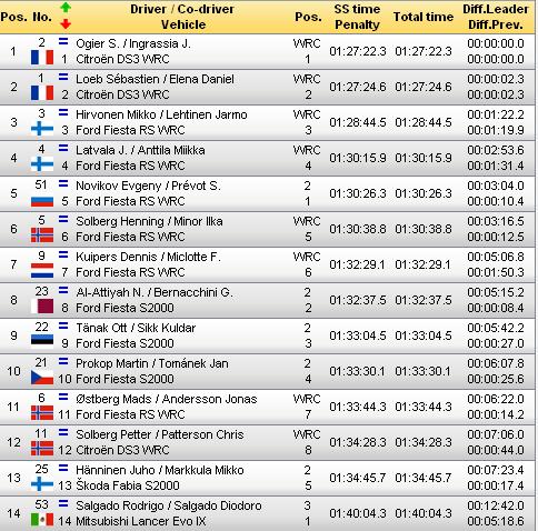 Tal decisão, deixa Sébastien Ogier na liderança do rally, quando no mínimo devia ter sido excluído e nem sequer um penalização levou. Os dois Citroën oficiais vão hoje abrir a estrada, com os dois homens da Ford a segui-los mas, a vantagem da Citroën é confortável mas, tudo pode acontecer.
